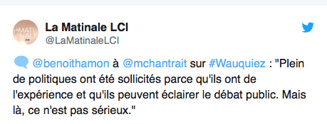 « Vous avez vu les guignols d’En Marche ? Ils sont tous avec le petit doigt sur la couture, ils doivent tous voter la même chose. Quand ils osent apporter la moindre dissonance, ils se font taper dessus avec une matraque. Il n’y a aucun équilibre des pouvoirs en France. Donc il y a une dictature totale en France ».