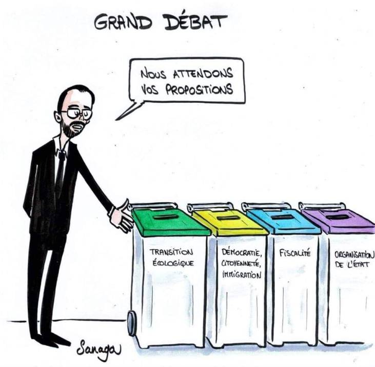 Question faux débat ou mascarade, cela me rappelle une grosse société qui convoque ses 10 principaux cadres pour une réunion qualifiée d’importante. La question est de quelle couleur doit-on repeindre les bureaux et la façade. Là les 10 cadres et le Président, et ses conseillers, choisissent des couleurs. Ils ne sont évidemment pas d’accord sur une seule couleur. Un des cadres en sortant dépité de la réunion ouvre par inadvertance des placards et y trouve des pots de peintures en nombre et qui n’ont jamais été ouverts… !!! La couleur avait donc déjà été choisie mais ce que le Président voulait c »était donner l’impression que le choix serait démocratique et pas imposé. Macron ne va pas jusque là puisqu’il définit déjà le cadre, les questions du grand débat… Et va savoir les réponses aussi !
