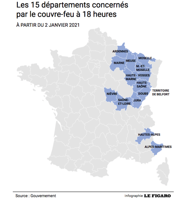 😔 On sait très bien que le gouvernement va étendre très vite cette liste tellement ce pouvoir est prévisible ! La carte du couvre-feu à 18 heures, carte officielle :